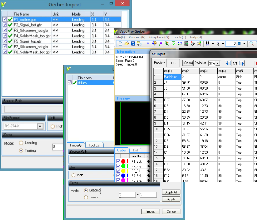 VayoPro-Gerber Expert is an essential tool for gerber data processing to electronics manufacturing. It supports varies gerber formats data source and load drill & D-code files quickly, convert pads & package in batch, instantly assign part name; and then output standard XY data(part infos), CAD data and Vayo job files (seamless connection for other Vayopro NPI software). In general, this easy tool shall assist equipment programming(placement, testing & inspection), document preparation and DFM/DFT analysis.